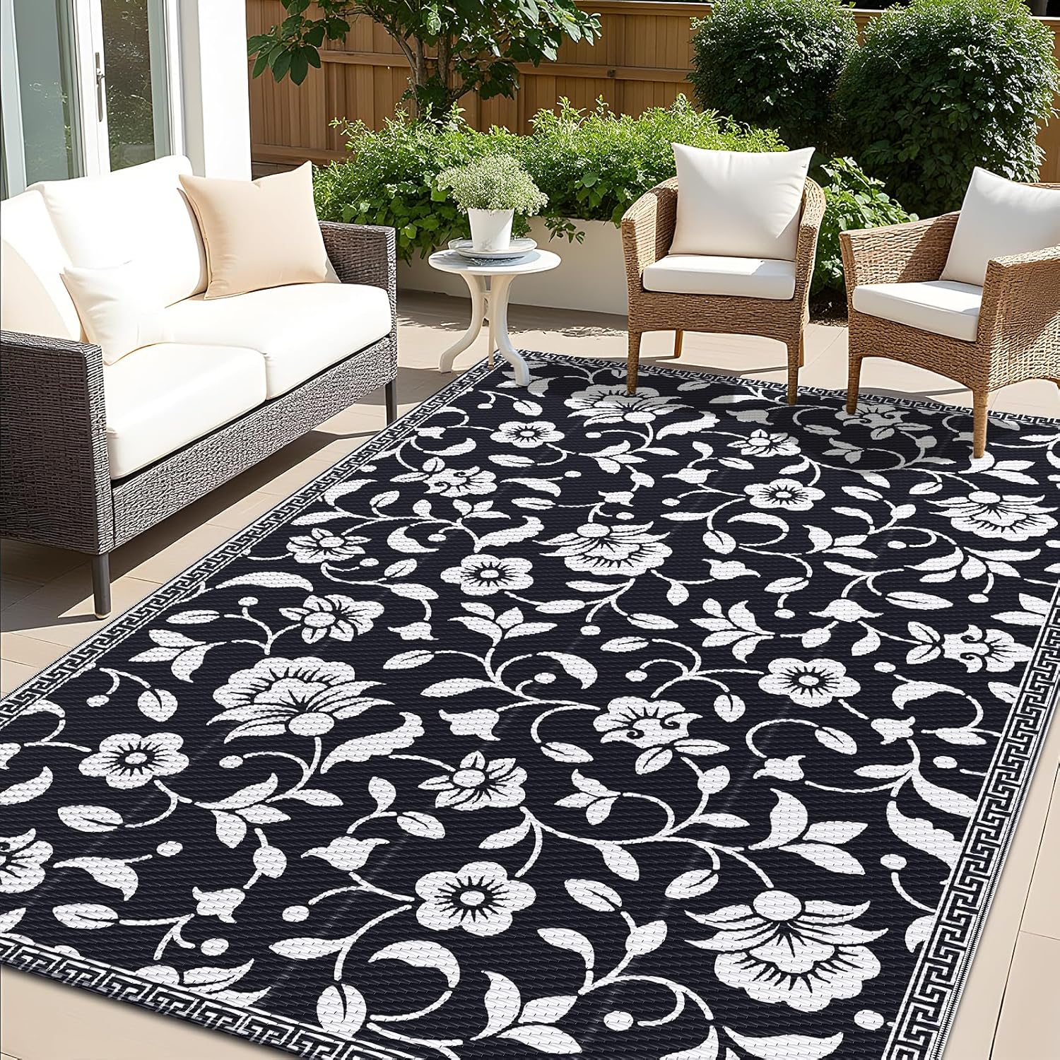 OLANLY Waterproof Outdoor Rug 5x8 ft, Outdoor Plastic Straw Rug with Flower Pattern, Reversible RV Mat for Patio, Camping, Balcony, Deck, Backyard, Black & White