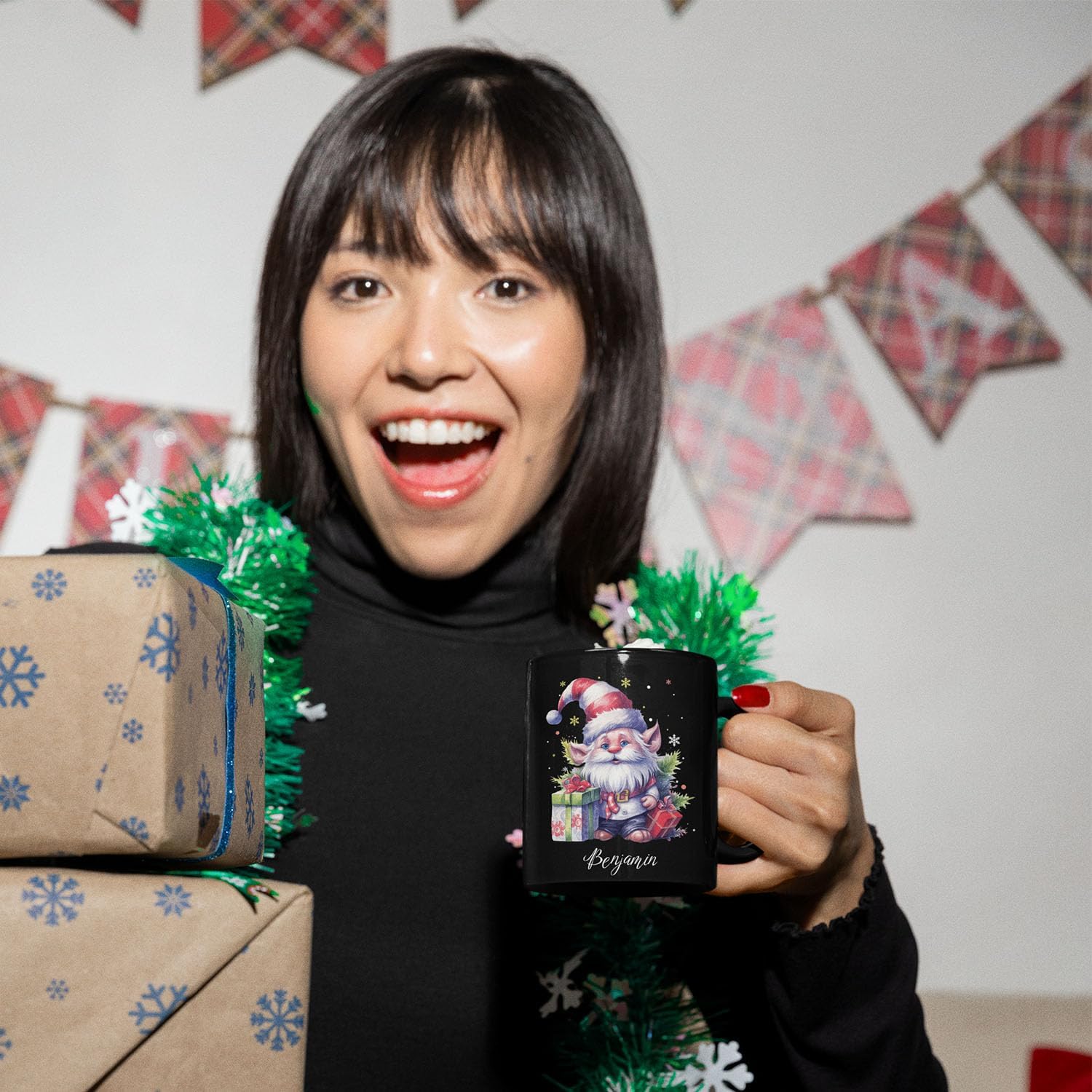 - π UNIQUE DESIGN MUG: Add some festive fun to your holidays with this "Cute Gnome And Gifts Design Mug" featuring an adorable gnome holding gifts. Click "Customize Now" to add a name, making it a great personalized gift for gnome lovers. This black ceramic mug is ideal for enjoying drinks during the Christmas season.