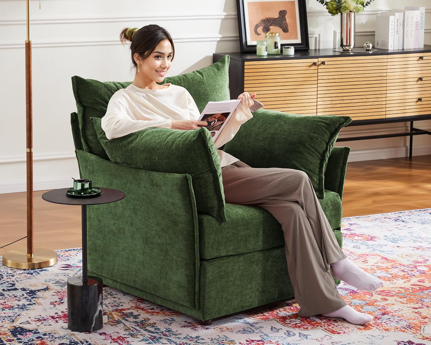 Oversized Accent Chair, Upholstered Modern Sofa Chair with Removable Backrest & Detachable Cover, 24.5" Deep Seat Large Reading Armchair for Living Room Bedroom Office - Chenille Green Set of 1
