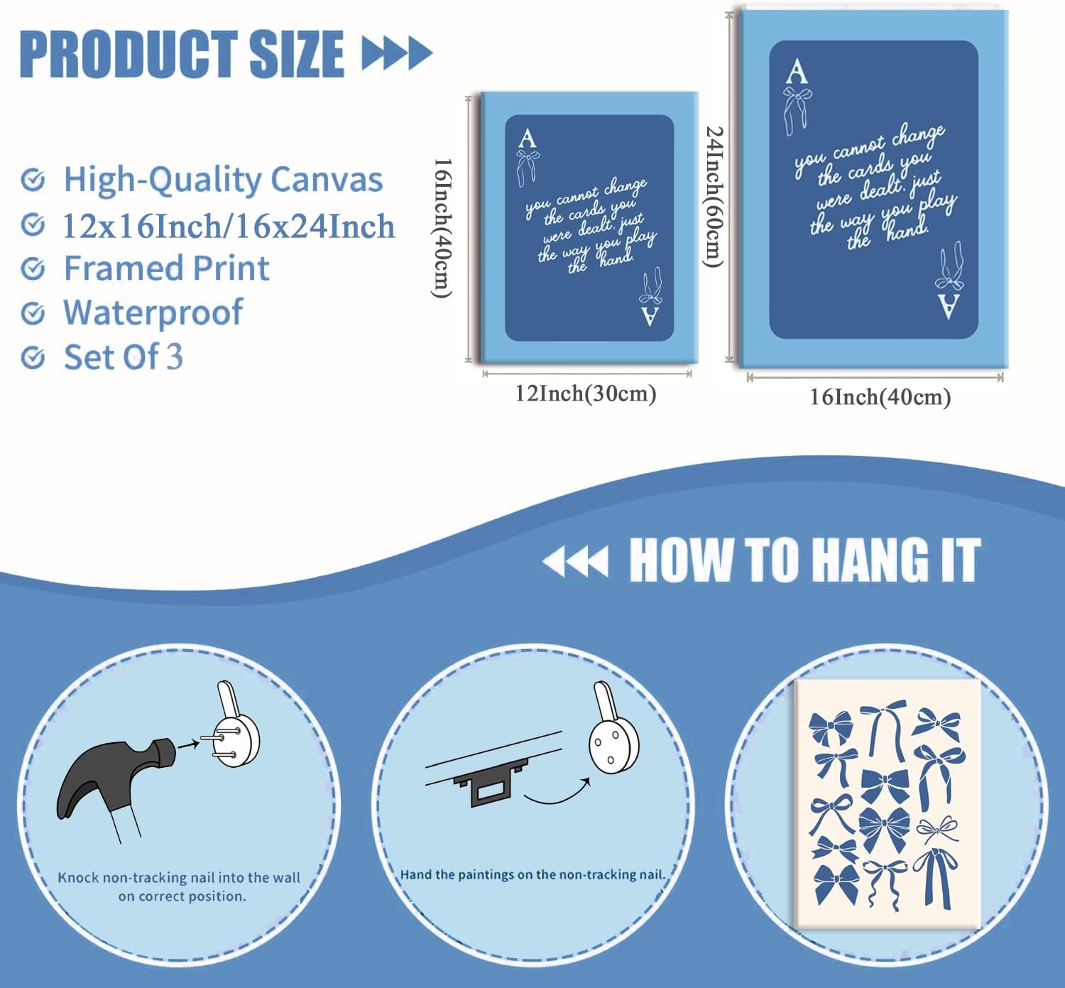 - Blue Wall Art Set of 3:With a mix of preppy and coquette wall decor, these prints are perfect for lovers of trendy wall art. Suitable for fans of blue room decor, college room decor, or those looking to create a unique, stylish aesthetic.Their bold blue hues fit perfectly into dorm decor or any room needing a stylish touch.
