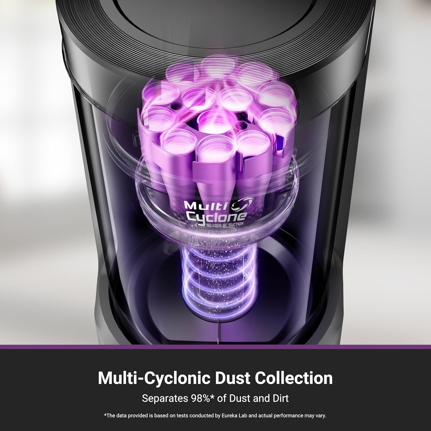 - ăMulti-Cyclonic Dust CollectionăEureka E20 Plus self-emptying robot vacuum cleaner comes equipped with a 13-cone structure, multi-cyclonic separation technology combines with powerful centrifugal force, generated by the suction during dust collection, to separate 98%* of dust and dirt before they reach the filter.
