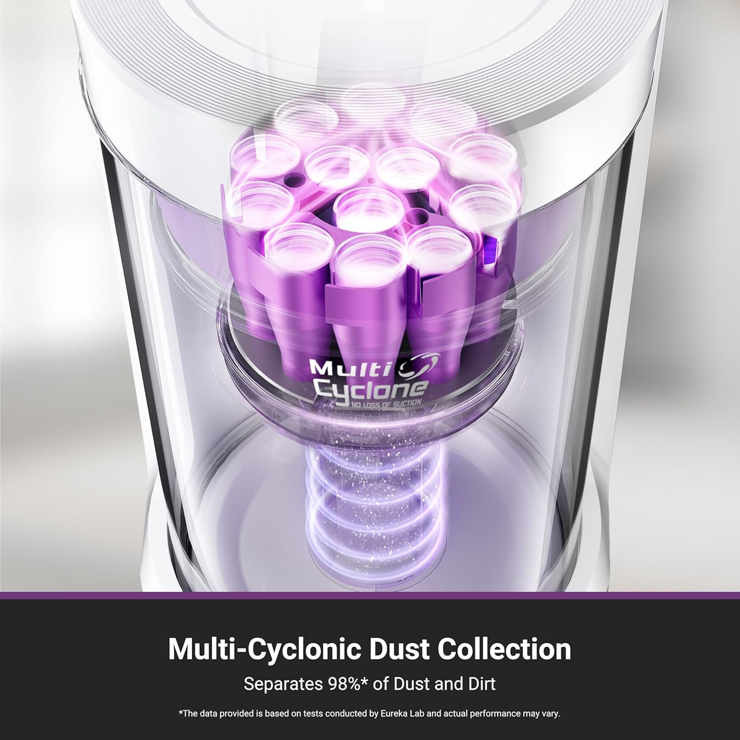 - ăMulti-Cyclonic Dust CollectionăEureka E20 Plus self-emptying robot vacuum cleaner comes equipped with a 13-cone structure, multi-cyclonic separation technology combines with powerful centrifugal force, generated by the suction during dust collection, to separate 98%* of dust and dirt before they reach the filter.