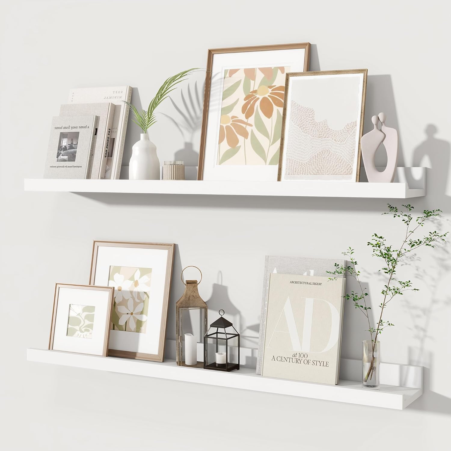 Fun Memories Picture Ledge Shelves Set of 2, 32 Inch Rustic Wall Mounted Floating Shelves with Lip for Home Storage and Décor in Bathroom, Kitchen, Nursery, Bedroom, Living Room, White