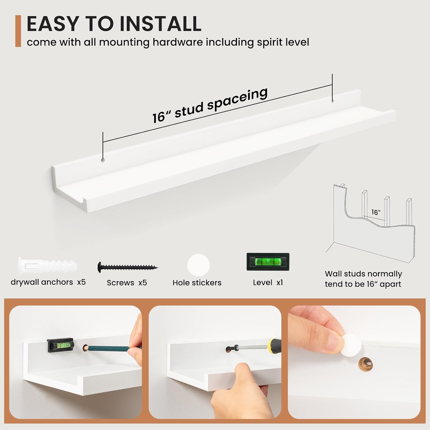 • Effortless Installation: Each shelf comes with pre-drilled holes and all necessary hardware, making installation quick and easy, so you can enjoy your new decor in no time.