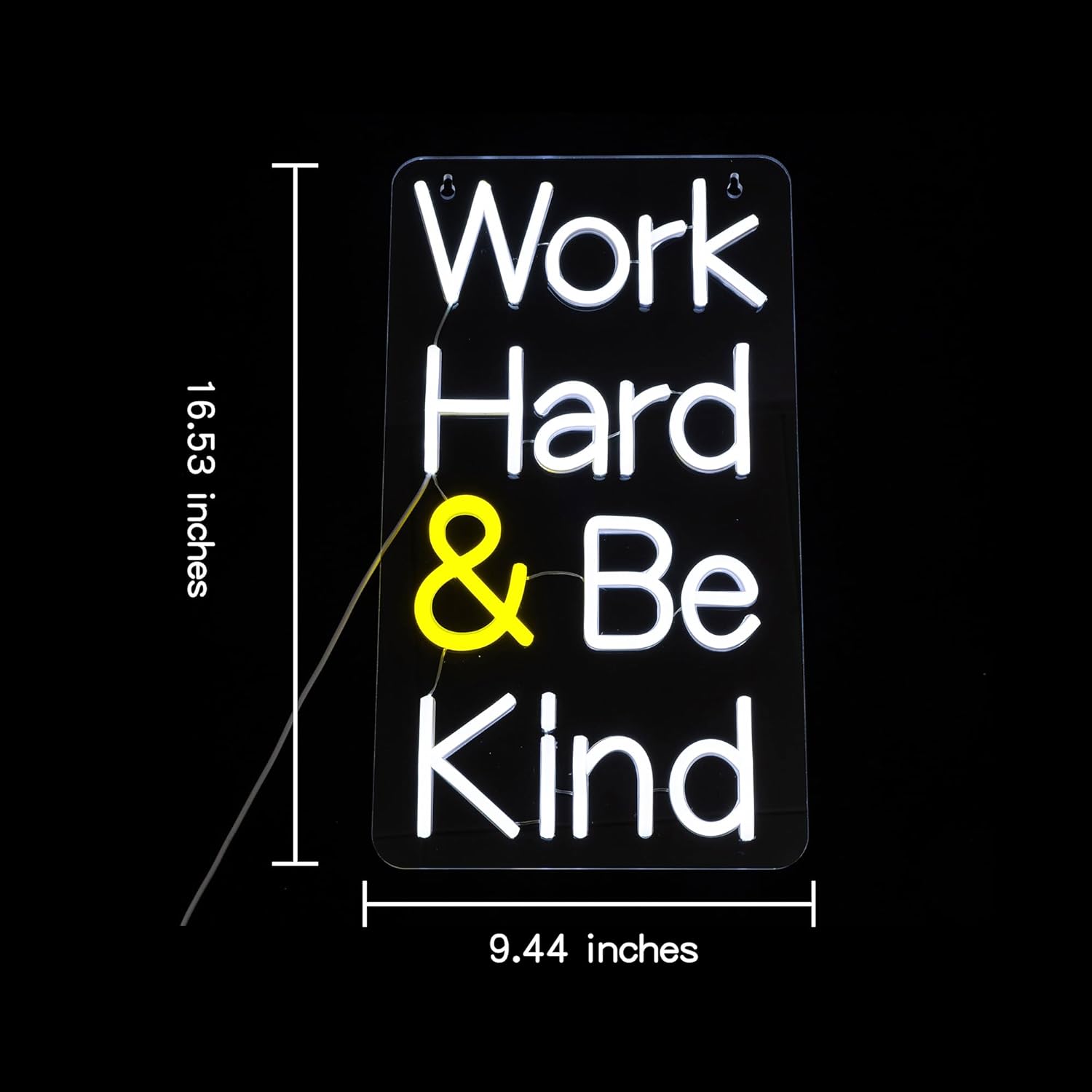 - Work Hard&Be Kind Neon Sign:Be kind neon signs is an inspirational phrase “work hard&be kind”. White letter neon sign lights up the space and is very motivating.
