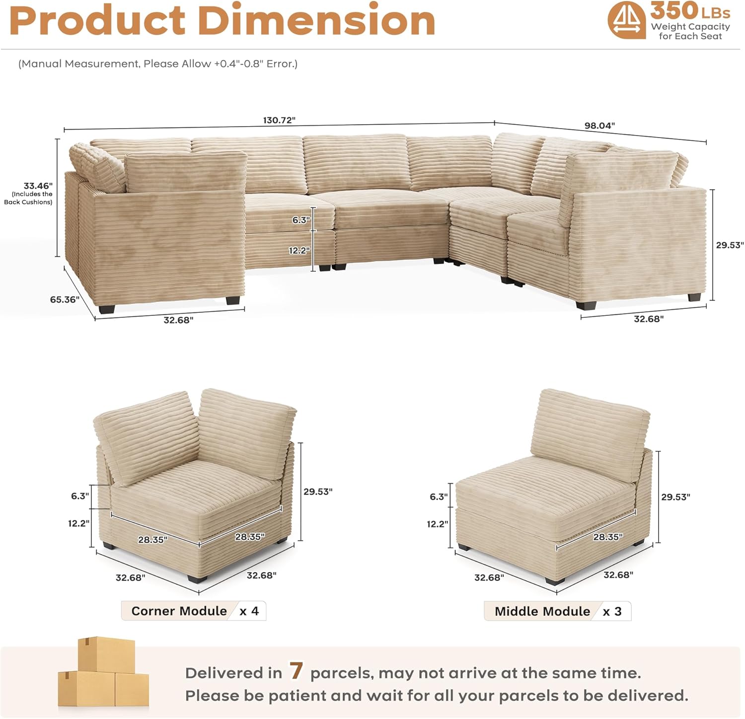 ovios Sectional Sofa Couch with U-Shape Chaise Oversized, Comfy Modular Cloud Couches with Deep Seat, Modern Upholstered Plush Corduroy Sofas Set for Living Room, 7-Seater, Beige
