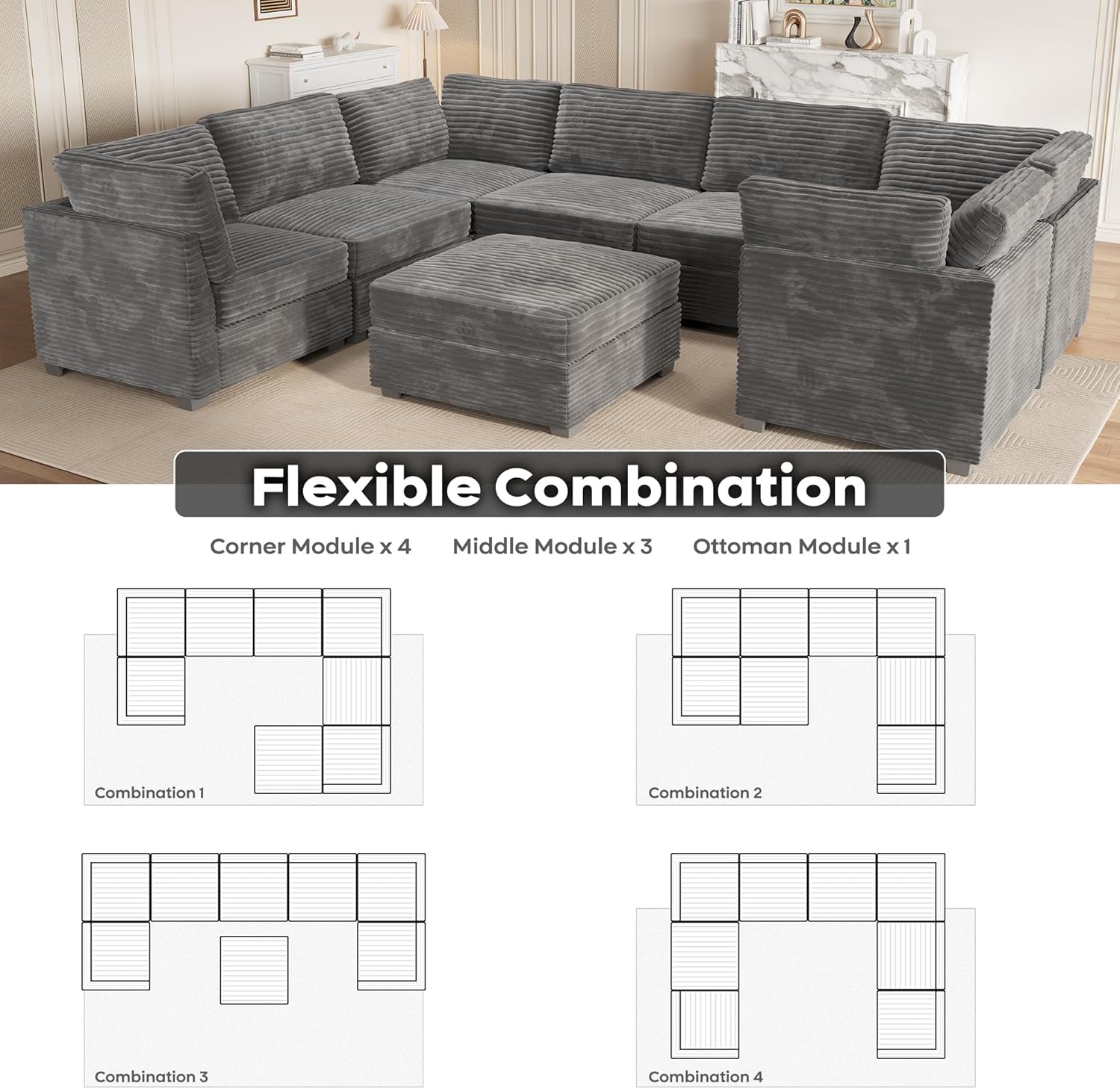 ovios Sectional Sofa Couch with U-Shape Chaise Sofa Bed, Comfy Modular Cloud Couches with Deep Seat, Modern Upholstered Plush Corduroy Sofas Set for Living Room, 8-Seater, Grey