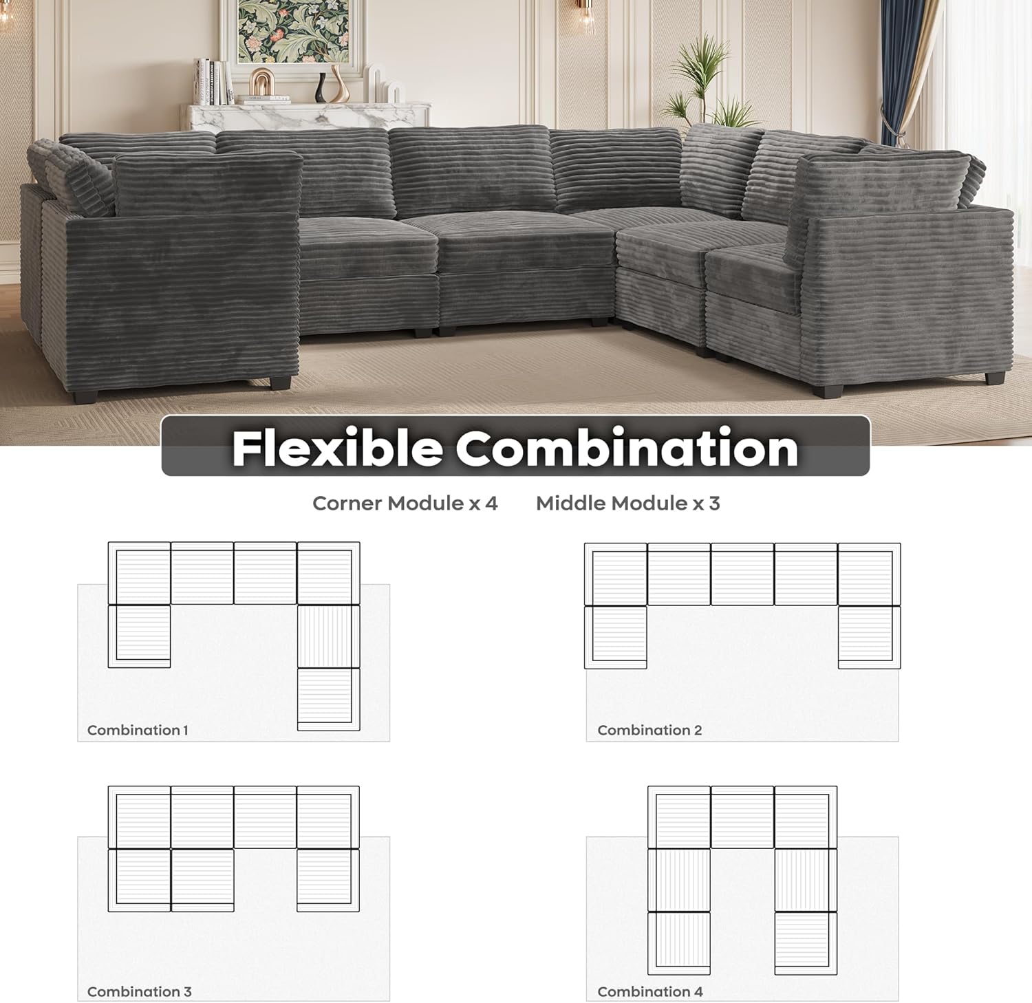 ovios Sectional Sofa Couch with U-Shape Chaise Oversized, Comfy Modular Cloud Couches with Deep Seat, Modern Upholstered Plush Corduroy Sofas Set for Living Room, 7-Seater, Grey