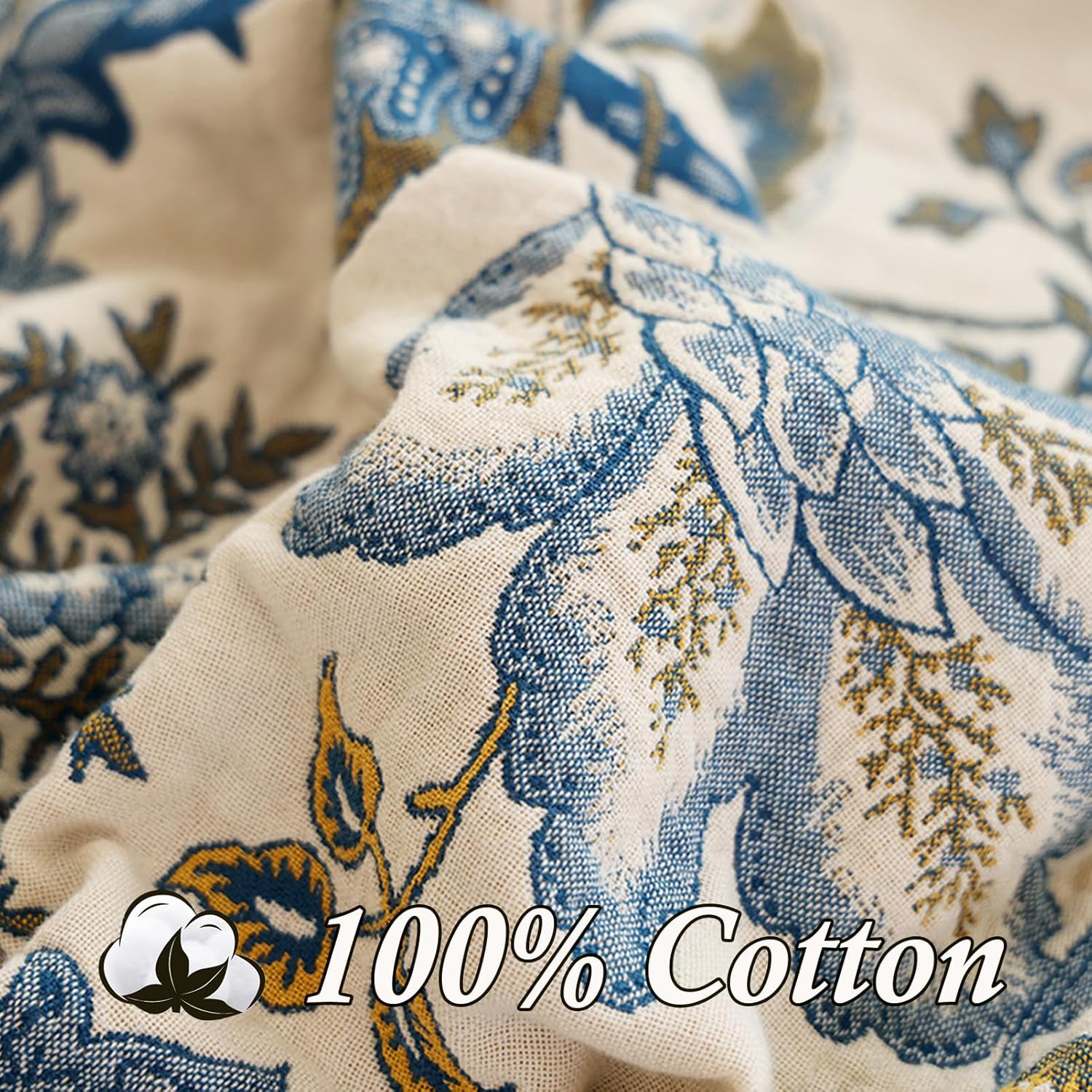 Snycler Boho Throw Blanket for Bed - 100% Cotton Ultra Soft Rustic Quilt - White Blue Floral Printed Farmhouse Decor Bed Blankets, 80"×90" All Season Rustic Throw for Sofa Couch Chair