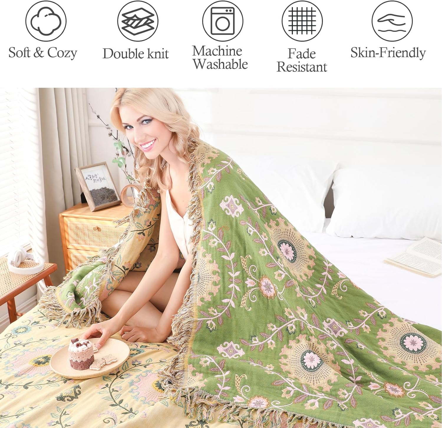 - UNIQUE DESIGN: This bohemian farmhouse blanket has a very chic, vintage look. Our bohemian bed blanket features a beautiful animal or floral geometric pattern on both the front and back and combines elements and vibrant colors.