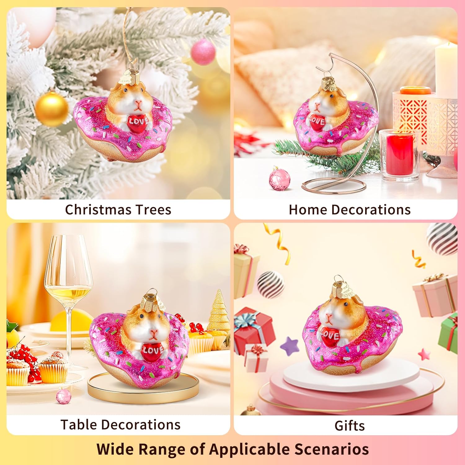 - Cute & Unique Design: Hand-blown glass christmas ornament adopts the image of a cute guinea pig. The golden guinea pig holds "love" and sits on a heart-shaped donut. It is cute and sweet. The whole is hand-painted, with exquisite craftsmanship, delicate and vivid image depiction. You can decorate any place you want to decorate, and believe it can be integrated well