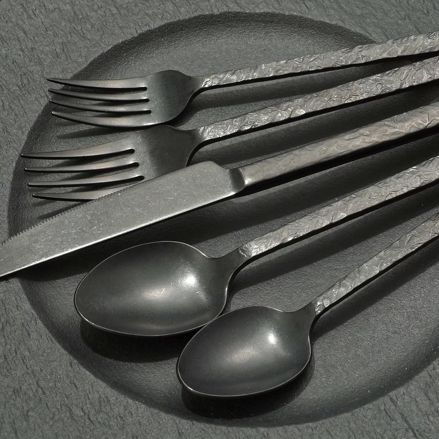 KINGSTONE 20 Pcs Black Hammered Silverware Set for 4, 18/10 Stainless Steel Heavy Duty Flatware Set, Tableware Cutlery Utensil Sets for Home Restaurant Dishwasher Safe