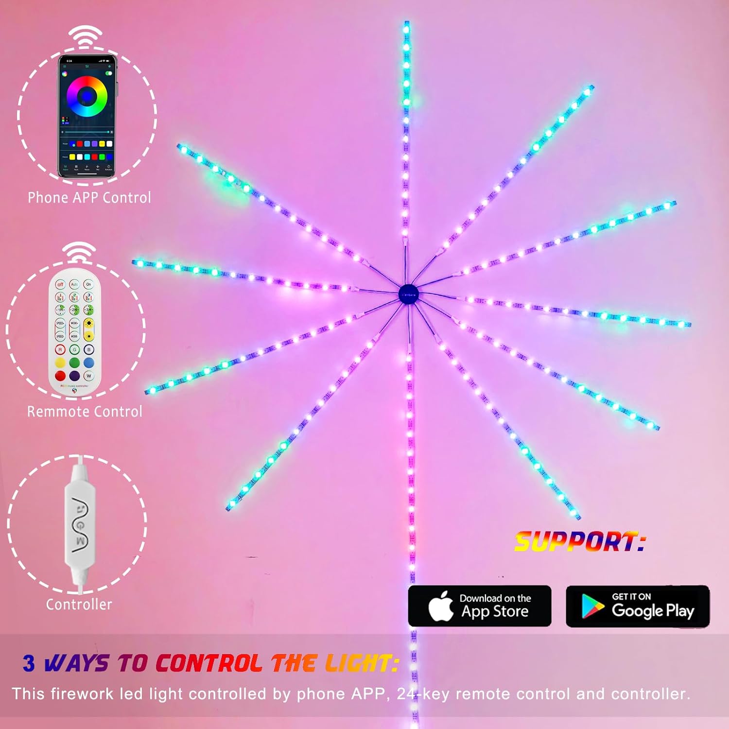 - šMulti-Function Smart Fireworks Lights: Upgraded firework led lights has 16 million colors, 213 dynamic color changing effects, music sync, timer, DIY the color and brightness adjustable etc functions. This LED strip lights can create firework launch effect for decoration.