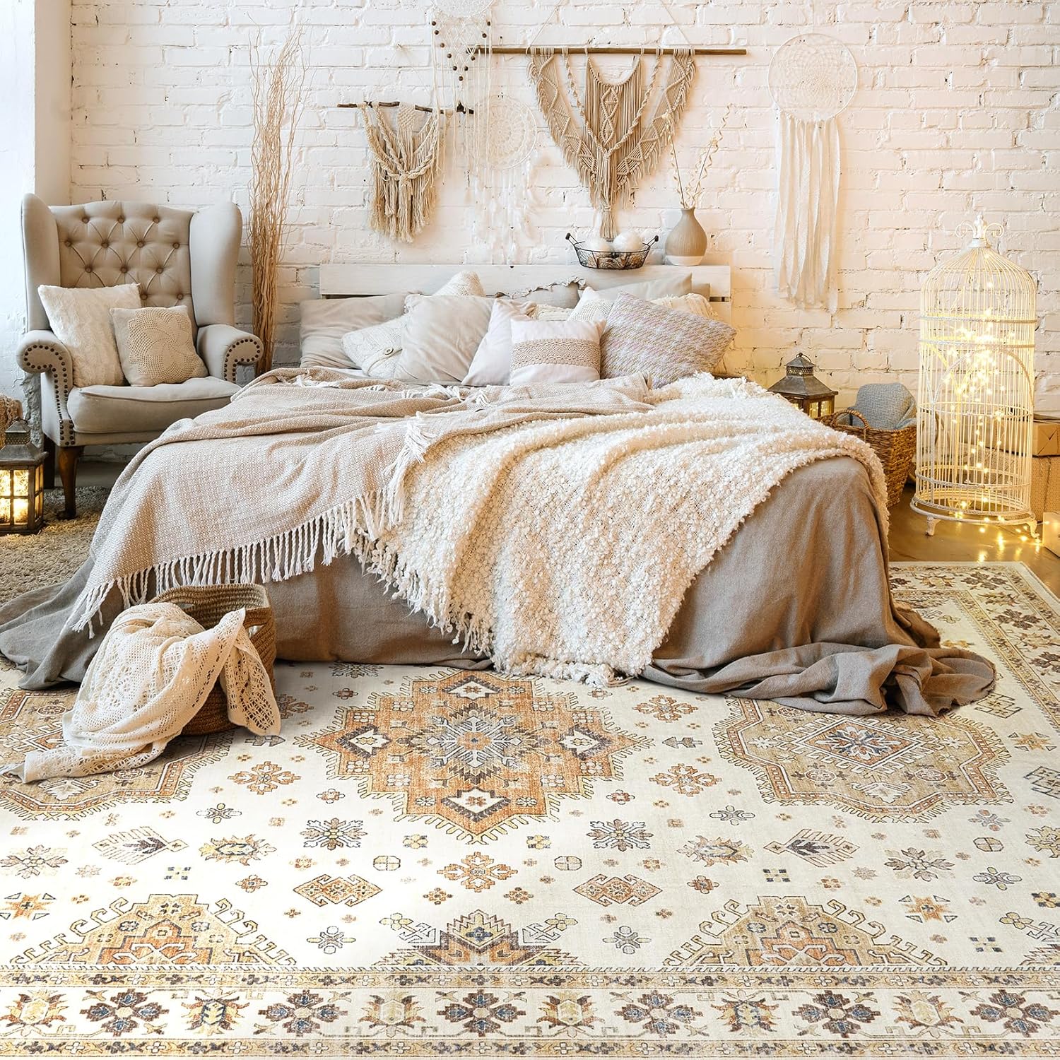Washable Area Rugs for Living Room - 7x9 Neutral Vintage Distressed Floral Farmhouse Boho Large Soft Floor Rug Indoor Non Slip Carpet for Living Room Bedroom Dining Room Office - Orange/Yellow/Beige