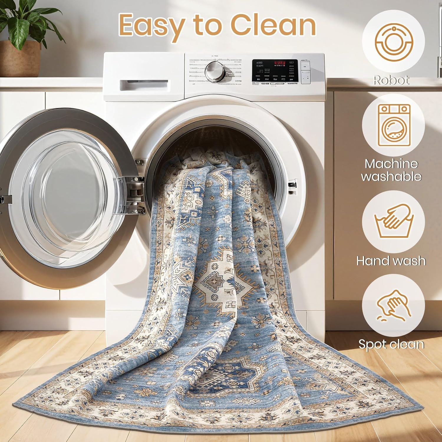 Washable Area Rugs for Living Room - 6x9 Neutral Vintage Distressed Floral Farmhouse Boho Large Soft Floor Rug Indoor Non Slip Carpet for Living Room Bedroom Dining Room Office - Blue