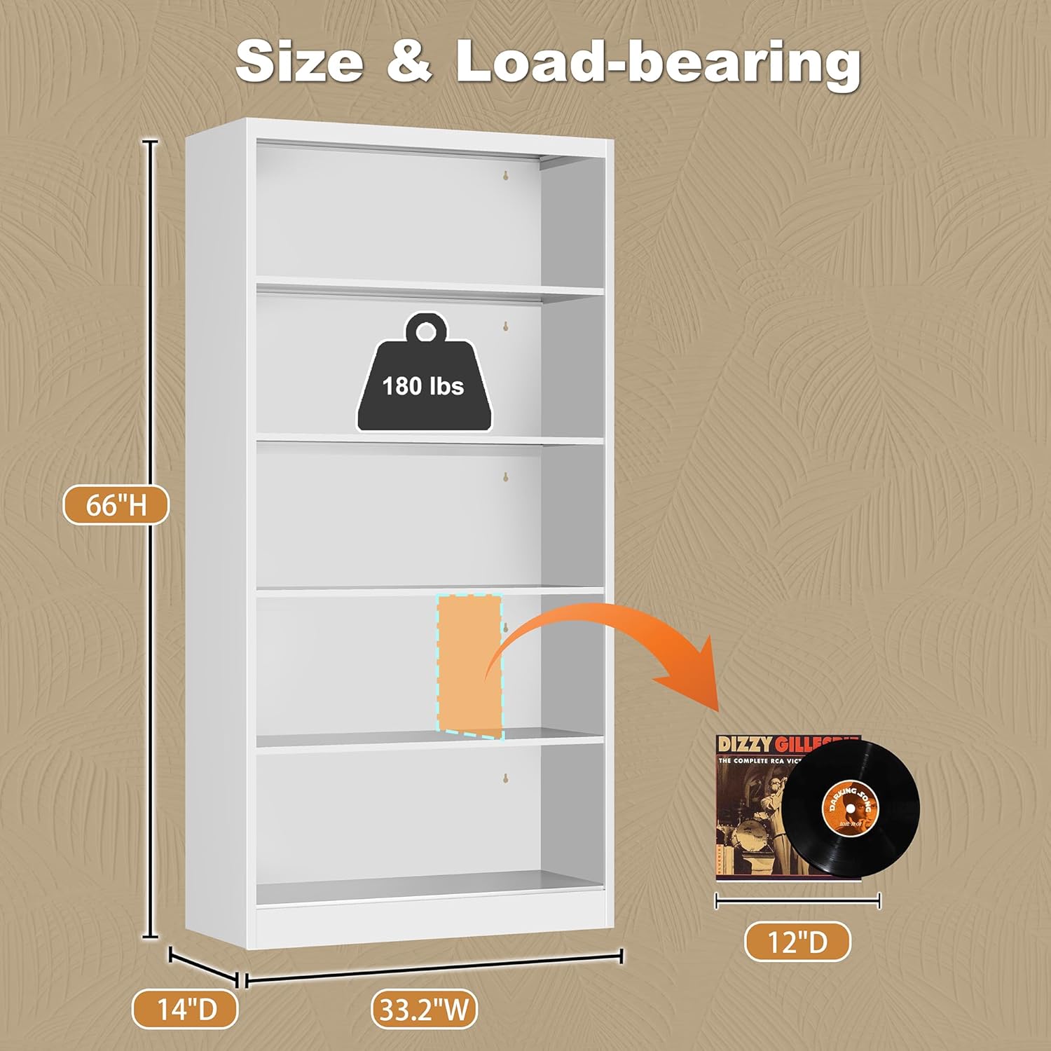 - ăDeep Wide Bookcaseă5 Tier bookshelf has a deep storage for maximum space. The total size of the bookshelf is 66 "H * 33.2" W * 14 "D. Large storage unit bookcase for vinyl records. Wide storage shelf has a large display space to meet the needs of work and life. While storing more DVDs, Blu-Rays, videogames, CD'sïŒmusic, movie , and models on the deep bookshelf, there is no need to worry about items falling off due to the spacious space.