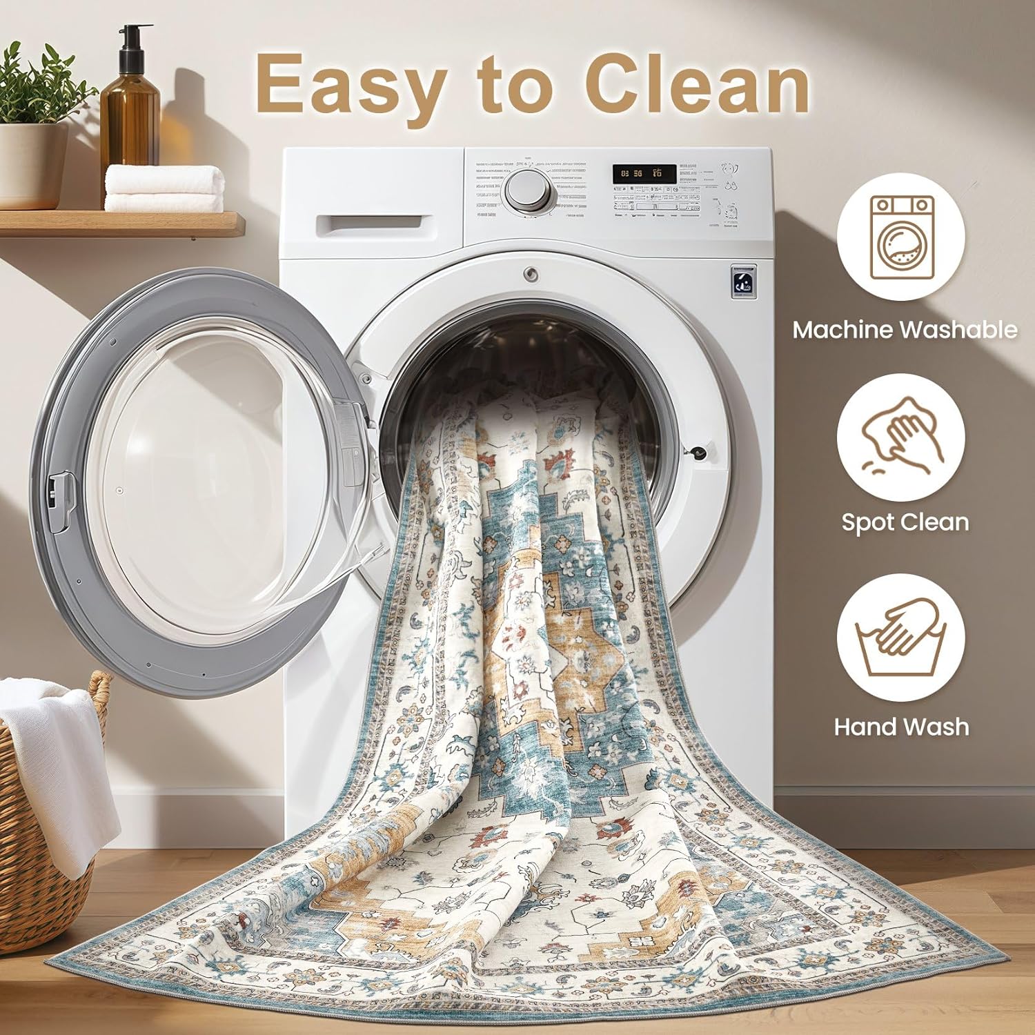 Washable Area Rugs for Living Room - 5x7 Neutral Vintage Distressed Floral Farmhouse Boho Large Soft Floor Rug Indoor Non Slip Carpet for Living Room Bedroom Dining Room Office - Blue/Yellow/Beige