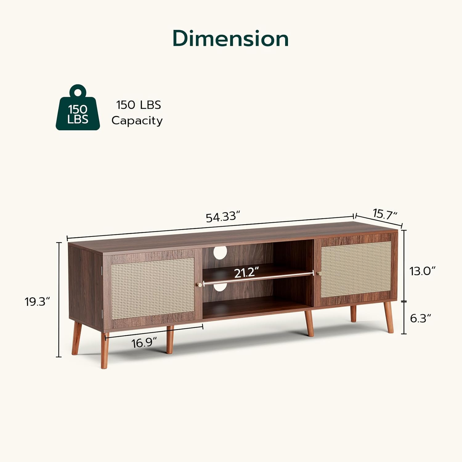 - SUITABLE FOR 65 INCH TV: TV stand supports TV up to 65 inches. Spacious desktop: 54.3'' x 15.7''. Prop your TV on this media cabinet for strong support or mount your TV to free up the tabletop for your beloved decorations, it will win with its mid-century and spacious type