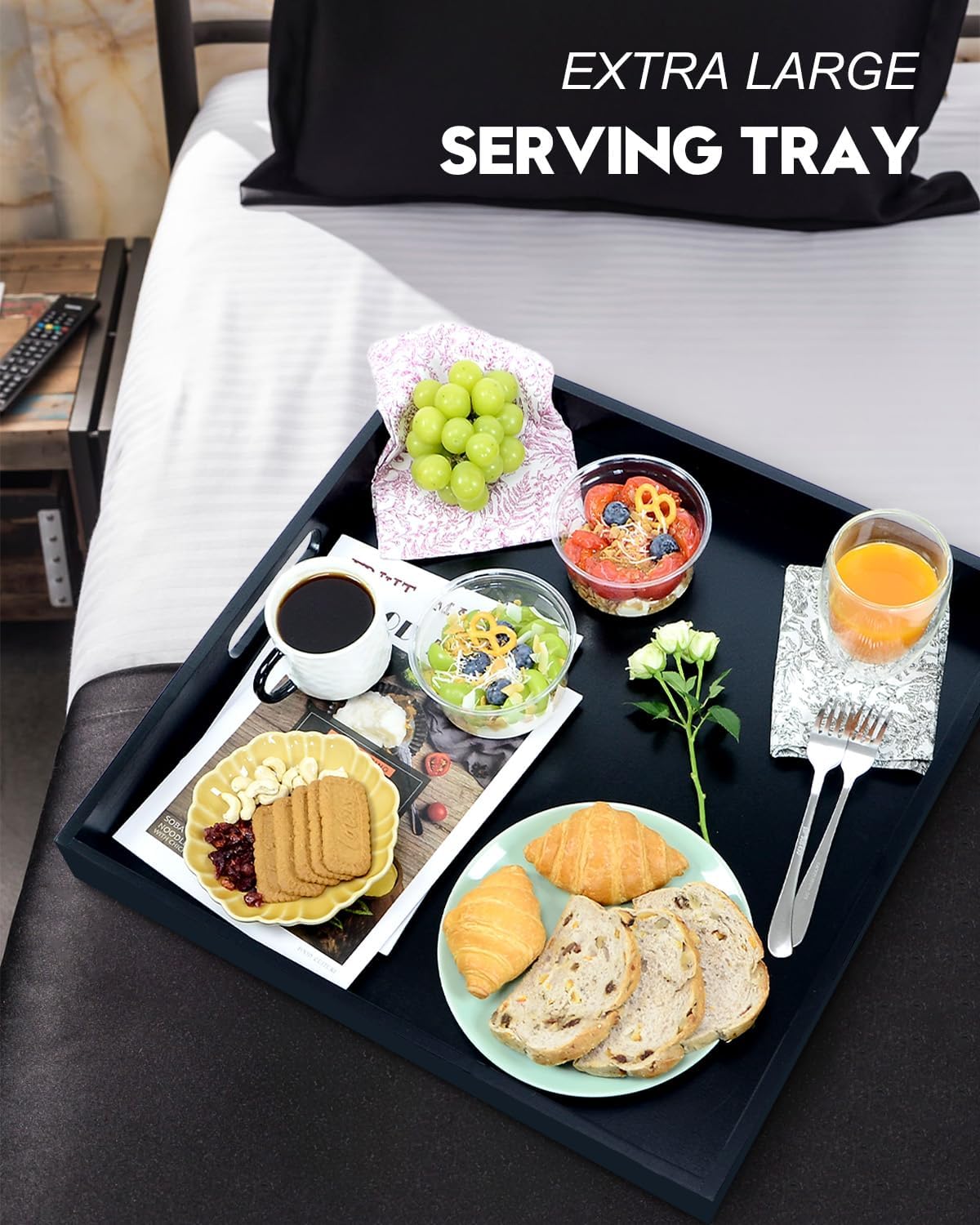 20 Inches Square Wooden Ottoman Tray Black, Large Wood Serving Tray with Handles for Living Room, Serving Food Breakfast, Ottoman Coffee Table Couch Sofa Kitchen