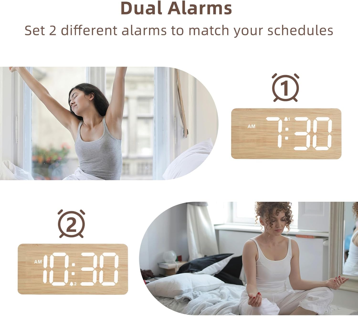 uscce Wooden Digital Alarm Clocks for Bedrooms: Dimmable Dual Alarm Clock with Large Numbers for Bedside Desk - Loud Alarm for Heavy Sleepers with Volume Control - Wood Decor & Gifts