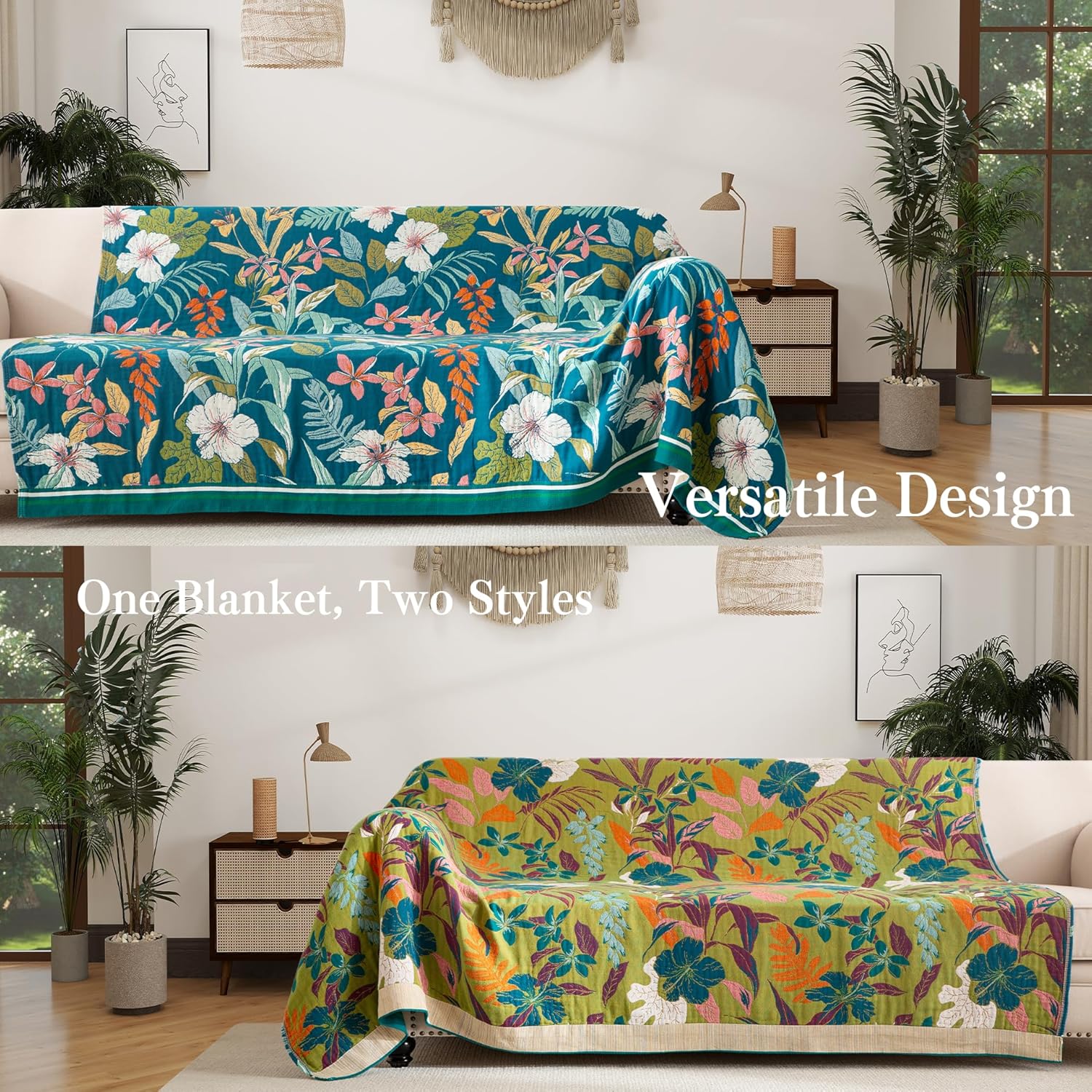 Boho Throw Blanket Full Size, Extra Large Soft Cozy Cotton Muslin Quilt Blanket for Bed Decor, Floral Patterned Couch Sofa Chair Cover, Vintage Farmhouse Cottage Woven Blanket, Teal&Green