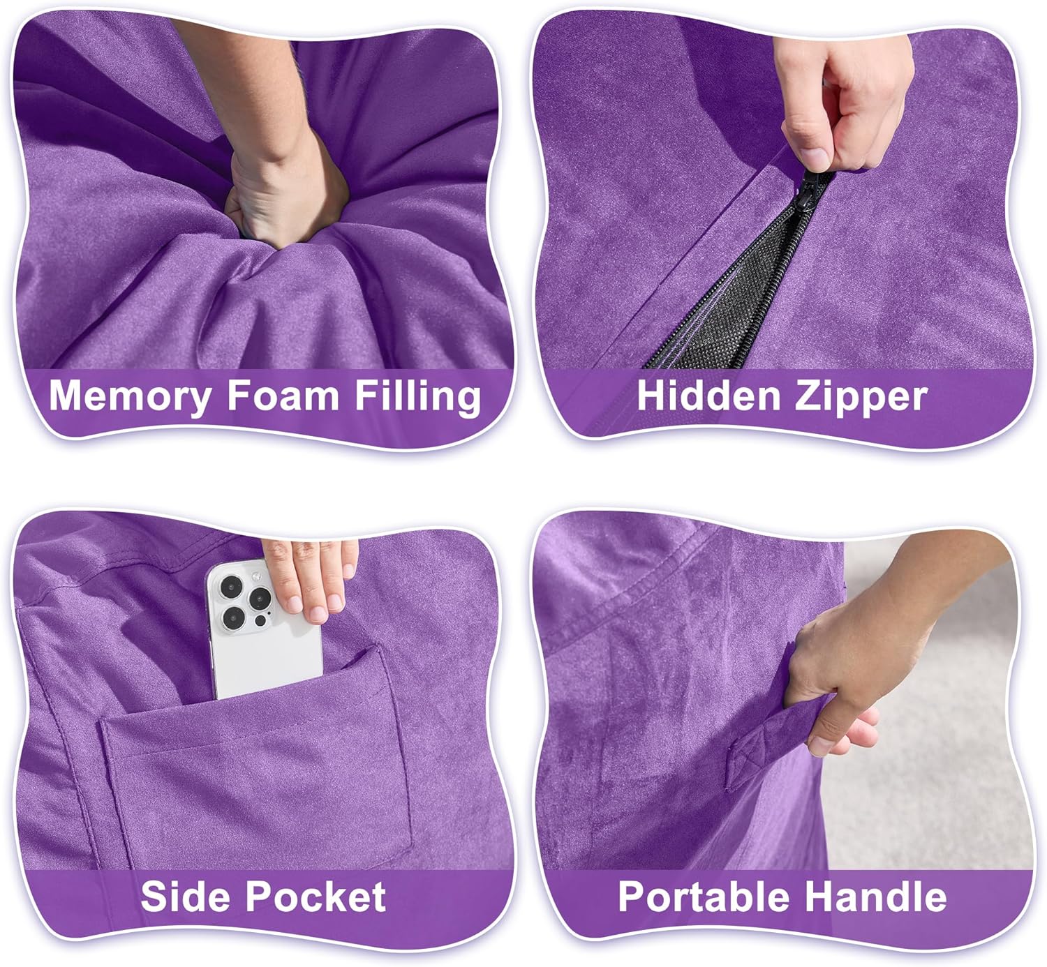• Convenient Design: Our adult bean bag chair is designed with handle so you can move the giant bean bag chair wherever you want. The adult bean bag chair has a medium sized pocket on the side to store your phone, remote control, books and some small items. With the hidden zipper, you can remove the bean bag cover and throw it in the washing machine for cleaning.