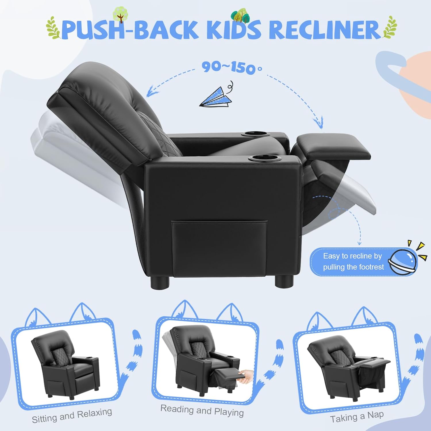 Kids Recliner Chair, Leather Push Back Kids Reclining Chair with Cup Holders & Side Pockets, Safety Adjustable Footrest Toddler Recliner for Age 3+, Kid Recliners for Girls Boys, Black