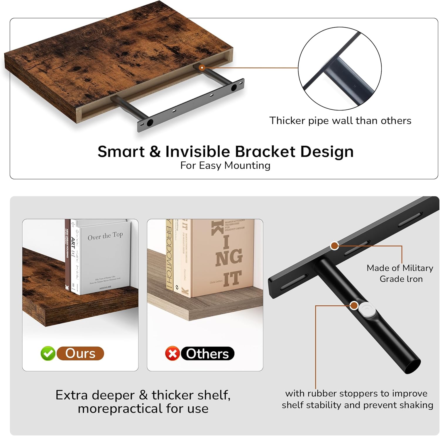 - Rustic & Modern Wooden Floating Shelves: Crafted from durable engineered wood with a realistic wood grain finish, our floating shelves offer the perfect blend of rustic charm and modern minimalism. The matte surface enhances its sleek, contemporary look, making it ideal for any room in your home. Whether you want to display your collection or organize essentials, these wall shelves seamlessly integrate with any décor and can be mounted on any wall to elevate your living space.
