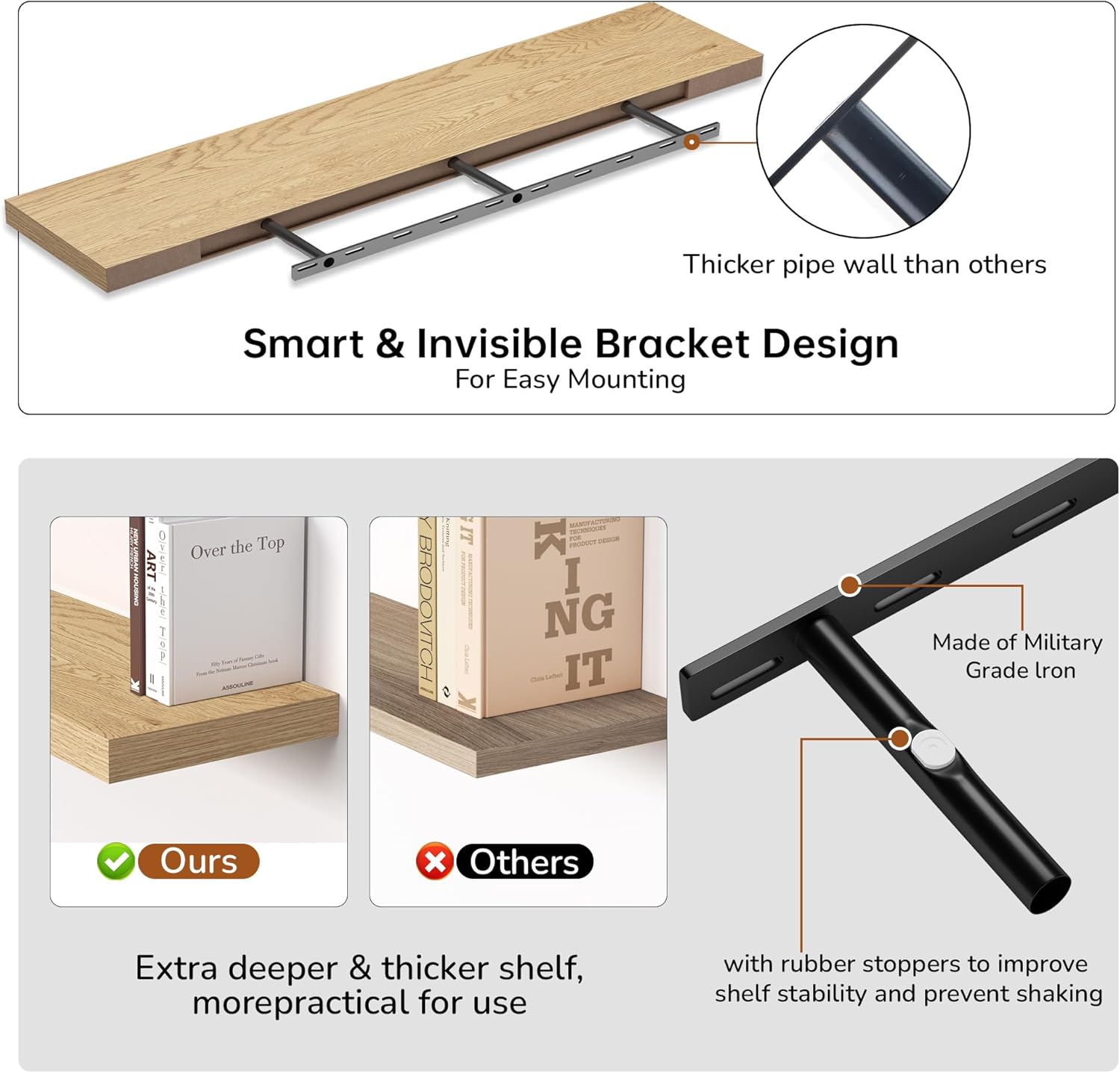 - Extra Deeper & Thicker - Each board measures 55"W x 9.3"D x 1.8"H. Extra deeper and thicker design in order to bring maximizes storage space and weight capacity, even hold up to 80 lb each. This floating shelf taking up zero square feet, reduces clutter and highlights décor in compact spaces.