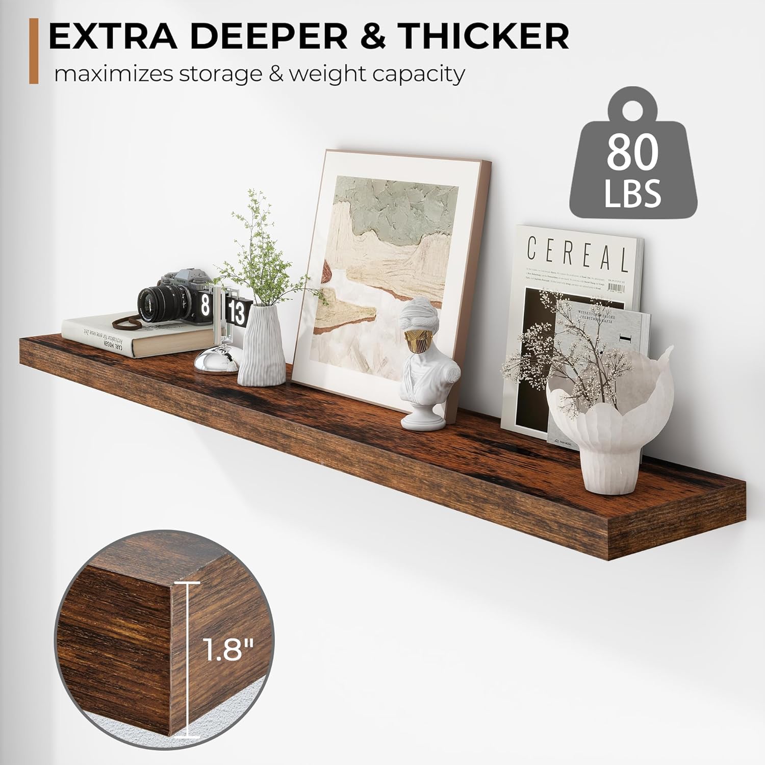 - Extra Deeper & Thicker - Each board measures 55"W x 9.3"D x 1.8"H. Extra deeper and thicker design in order to bring maximizes storage space and weight capacity, even hold up to 80 lb each. This floating shelf taking up zero square feet, reduces clutter and highlights décor in compact spaces.