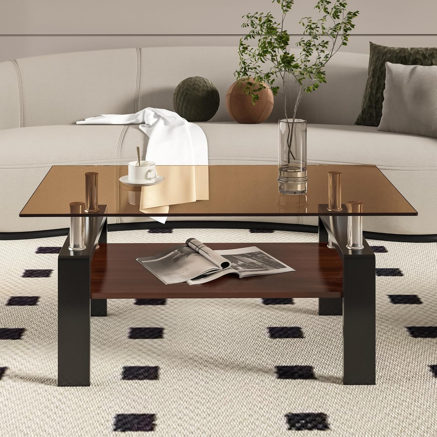 - Convenient Storage Space: The coffee table for living room is equipped with a walnut MDF layer and a glass top, 2 tiers offer additional storage space.
