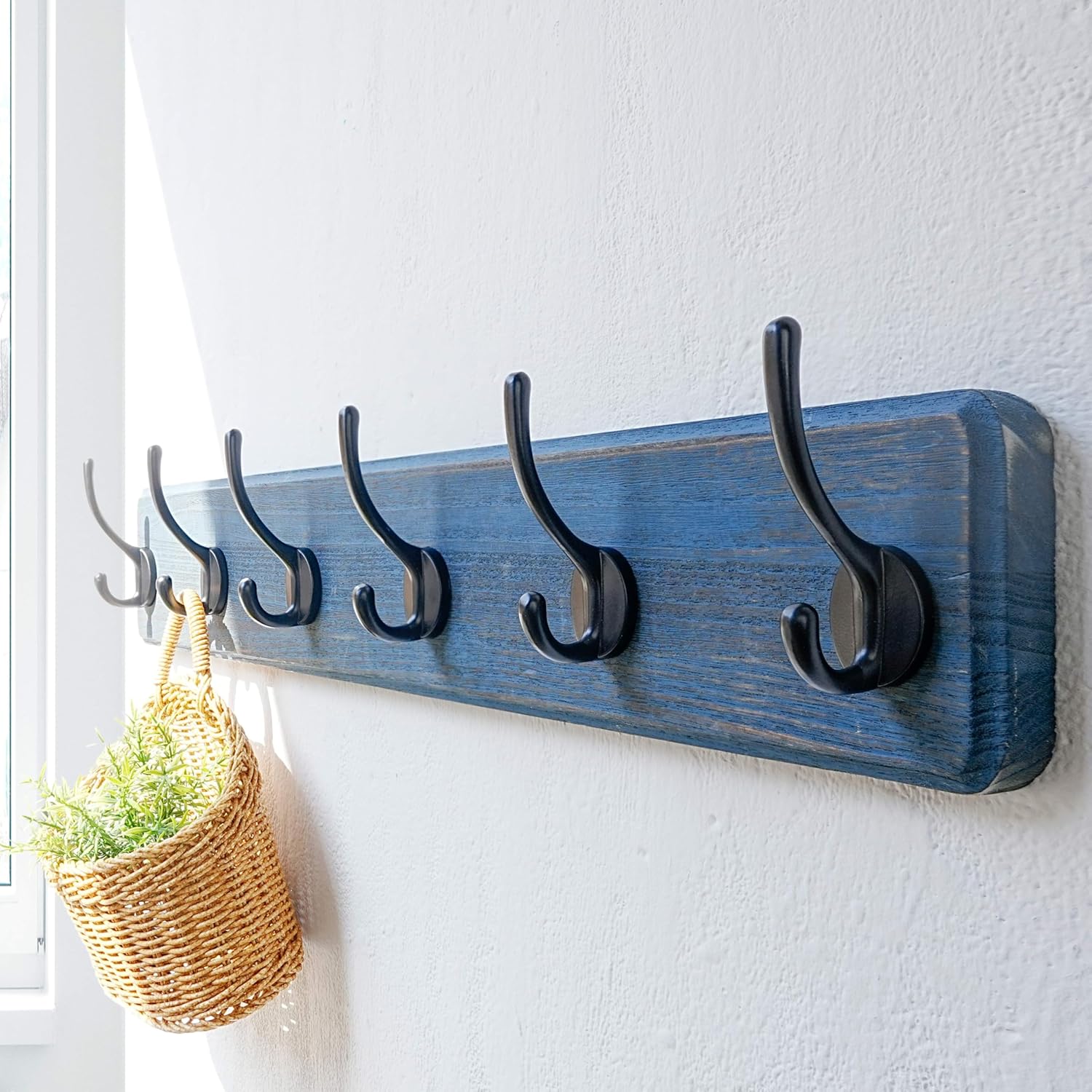 Dseap Coat Rack Wall: 24" Long, Patented, Heavy-Duty, 6-Double-Hooks Wooden Wall Mounted Coat Rack Coat Hanger Hook Rail for Winter Coats Hat Jacket Clothing, Weathered Blue, Pack of 2