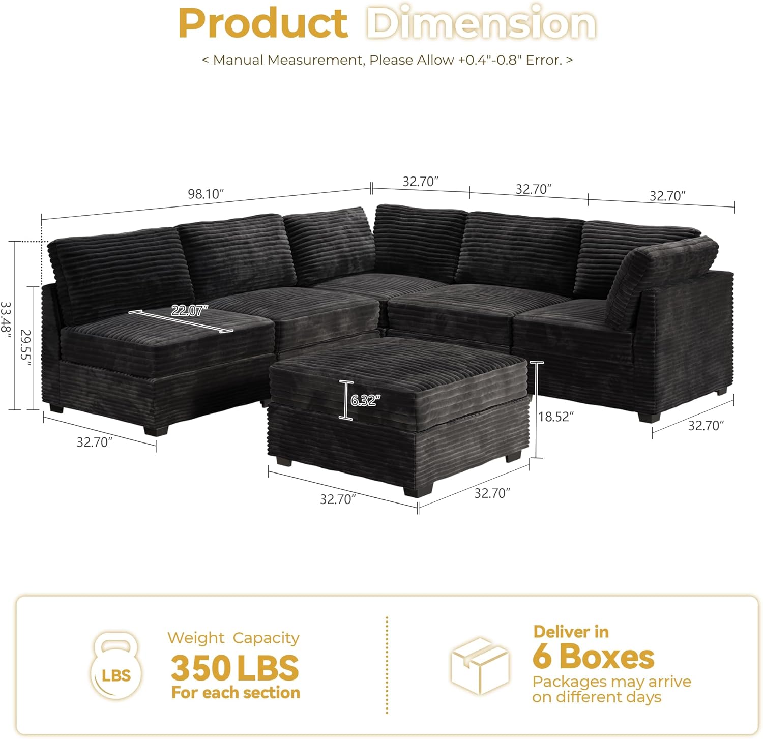 - Modular Sectional: 100% Free combination with 6 pieces individual sections. Make it straight I shape, U shape, L shape, bed shape, etc. Versatilely fits for daily use, family happy hours, party hosting