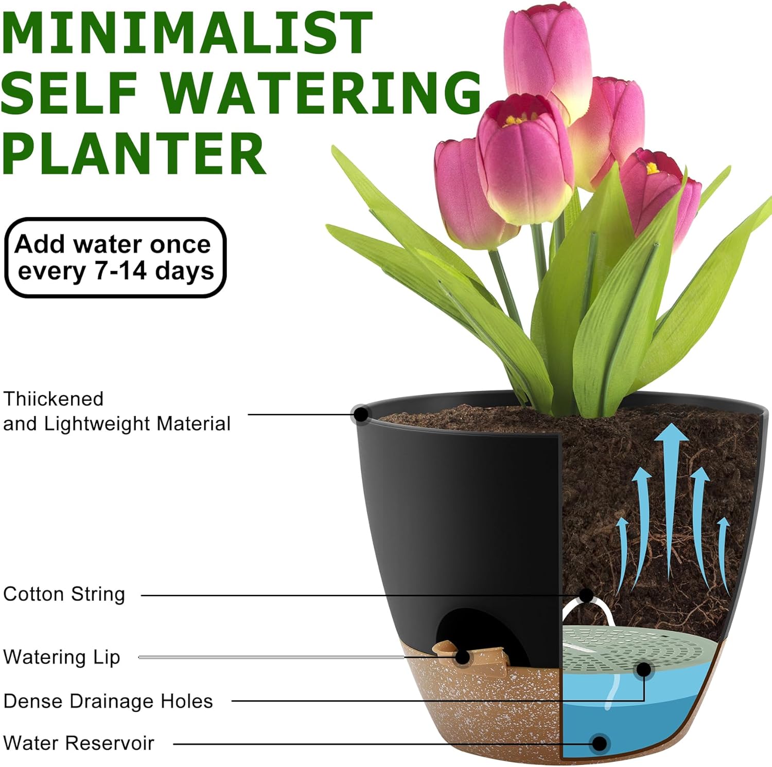 - 【Different Size Combo】These Self watering pots combines with 5 different sizes.10inch/9inch/8inch/7.5inch/7inch plant pots.Suitable for indoor and outdoor planting of various plants and flowers,Such as Snake Plant,ZZ Plant,Aloe,African,Violet,Monstera etc.
