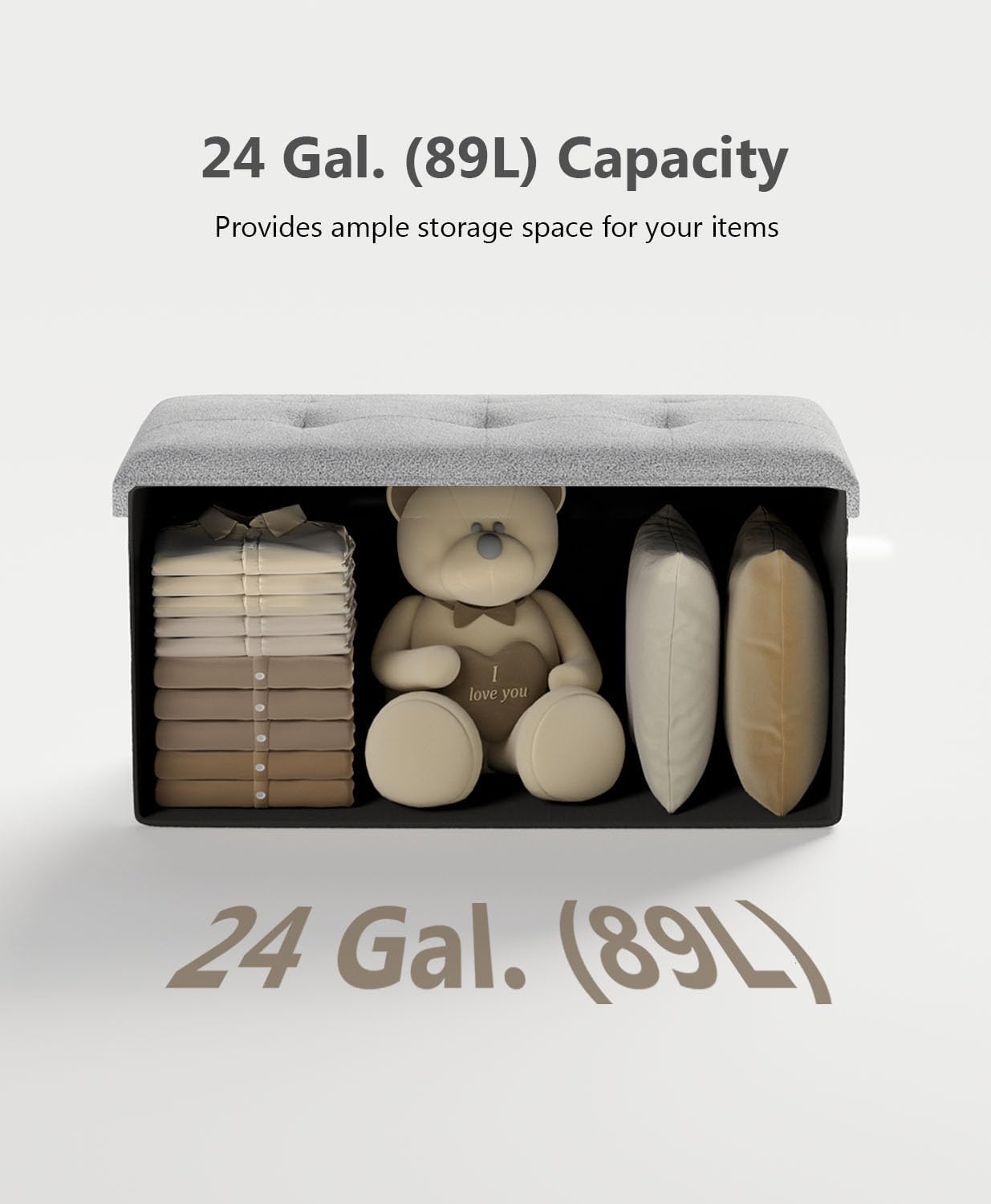 - [Plenty of Storage Space] This folding ottoman, sized 15”D x 30"W x 15”H (38 x 76 x 38 cm) with a total capacity of 24 gallons, can be used to neatly organize your bed sheets, pillows, blankets, magazines, and more