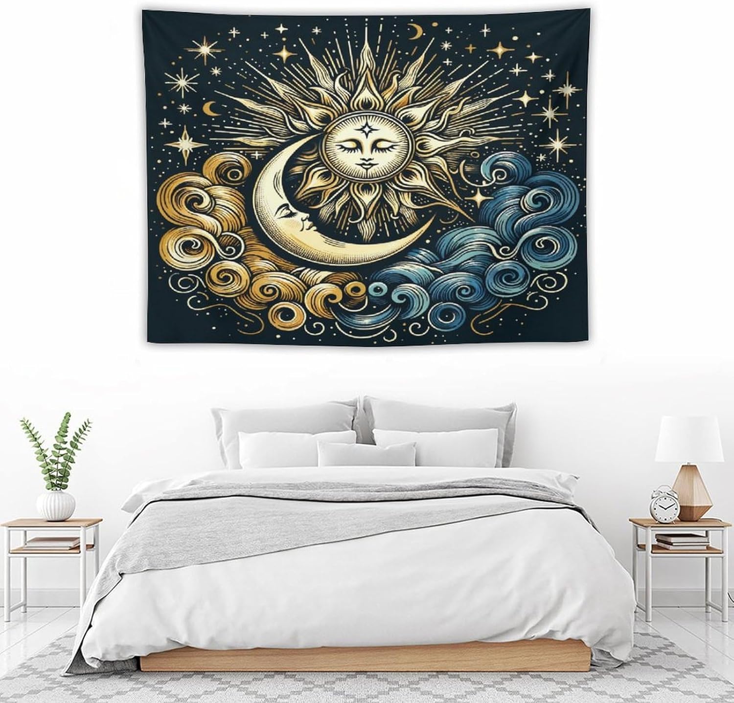 HZOHNAGO Sun Moon Tapestry Boho Golden Stars Pattern Printed Wall Tapestry Wall Hanging for Bedroom Living Room Dorm 40" W x 30" H