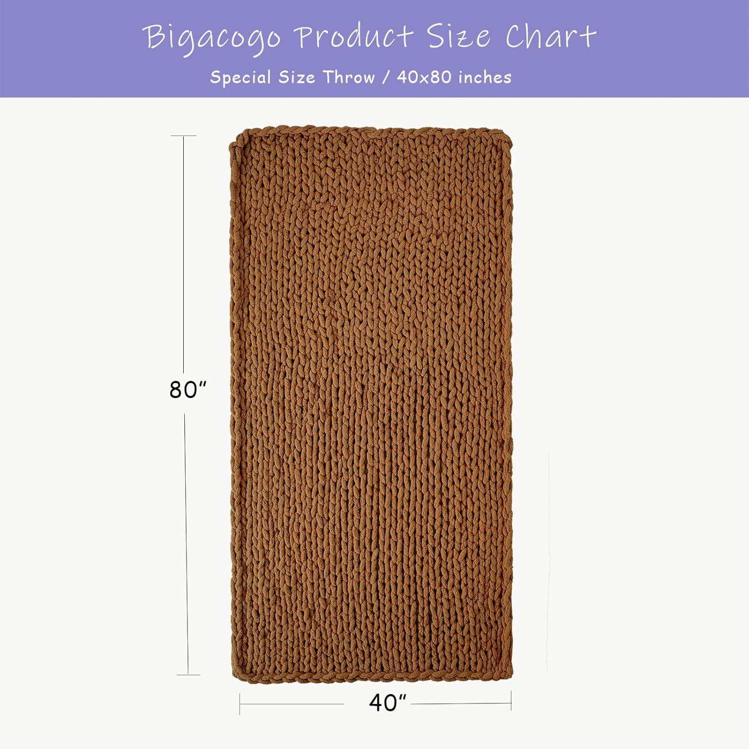 Bigacogo Chunky Knit Throw Blanket for Couch, 40x80 inches, 100% Hand Knitted with Thick Jumbo Chenille Yarn, Cozy Soft Large Rope Knot Cable Crochet Blankets for Sofa Bed Living Room, Caramel