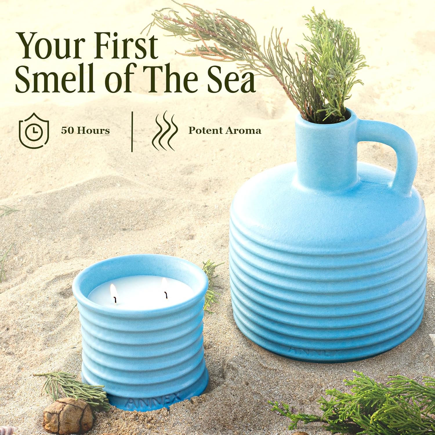 Scented Luxury Candles in Handmade Ceramic Jars, Soy Wax | Day On The Sea – Cypress & Cedar, Large Candle | Non Toxic, 2 Wicks, Reusable Big Blue Jar | Natural Spring Aromatherapy for Women & Men