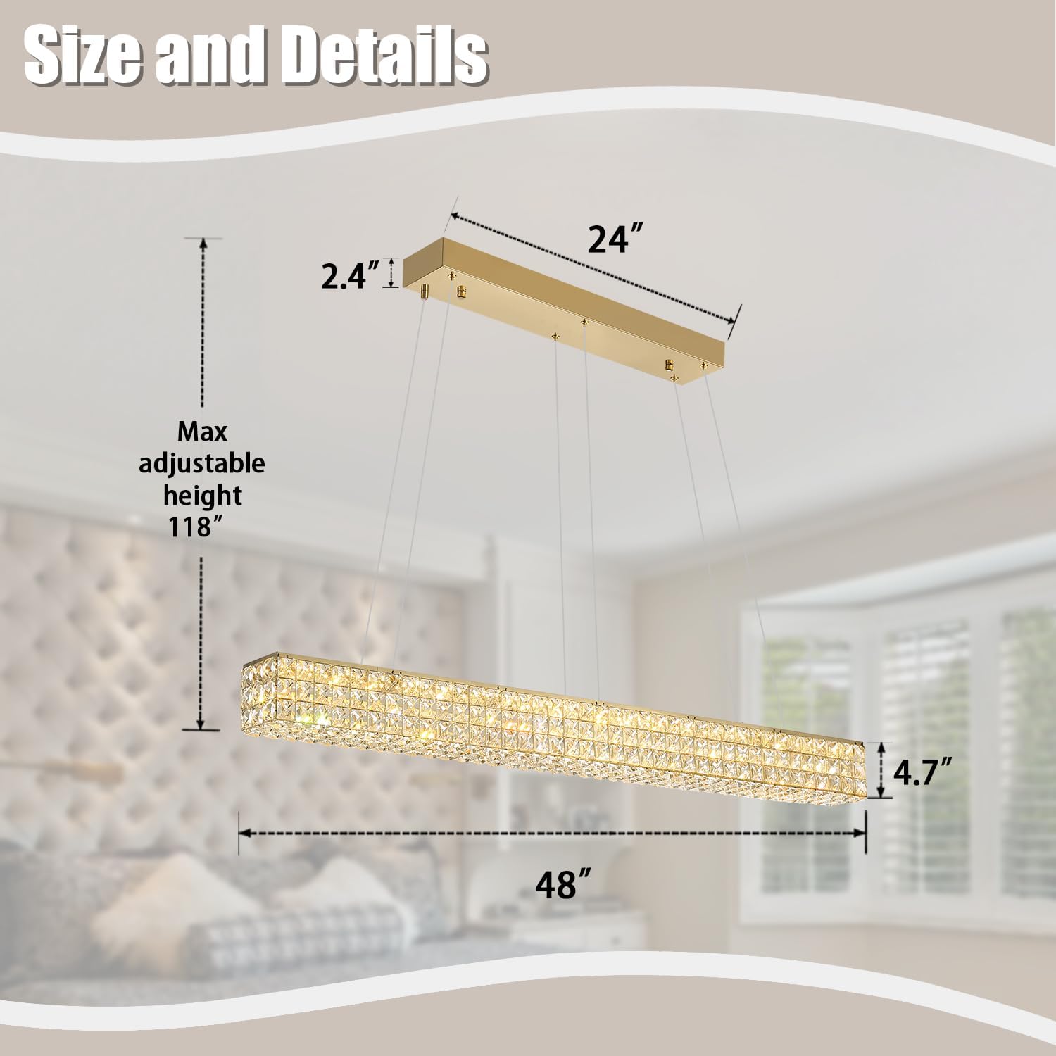 - 【Rectangular Chandelier's size】L48"*W4.7*H118",The pendant cord is adjustable, with the shortest adjustable height being 20". It seamlessly blends into any space with its stunning presence, making it a remarkable addition to your living room, dining room, or foyer.