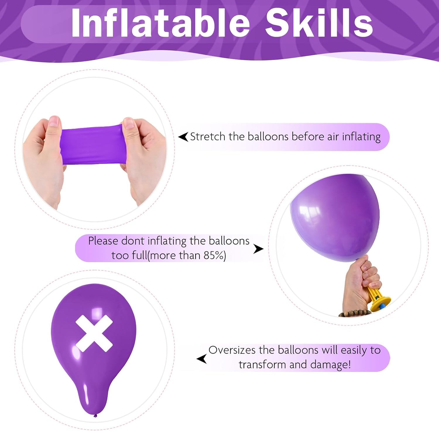 - Warm Tips: Please avoid exposing birthday balloons to direct sunlight before use to avoid affecting the quality and life of the bulk balloons; During the inflation process: Please inflate the globos into a round shape to prevent the helium balloons from bursting; Choking Hazar: Adult supervision is required; Keep uninflated assorted balloons away from children