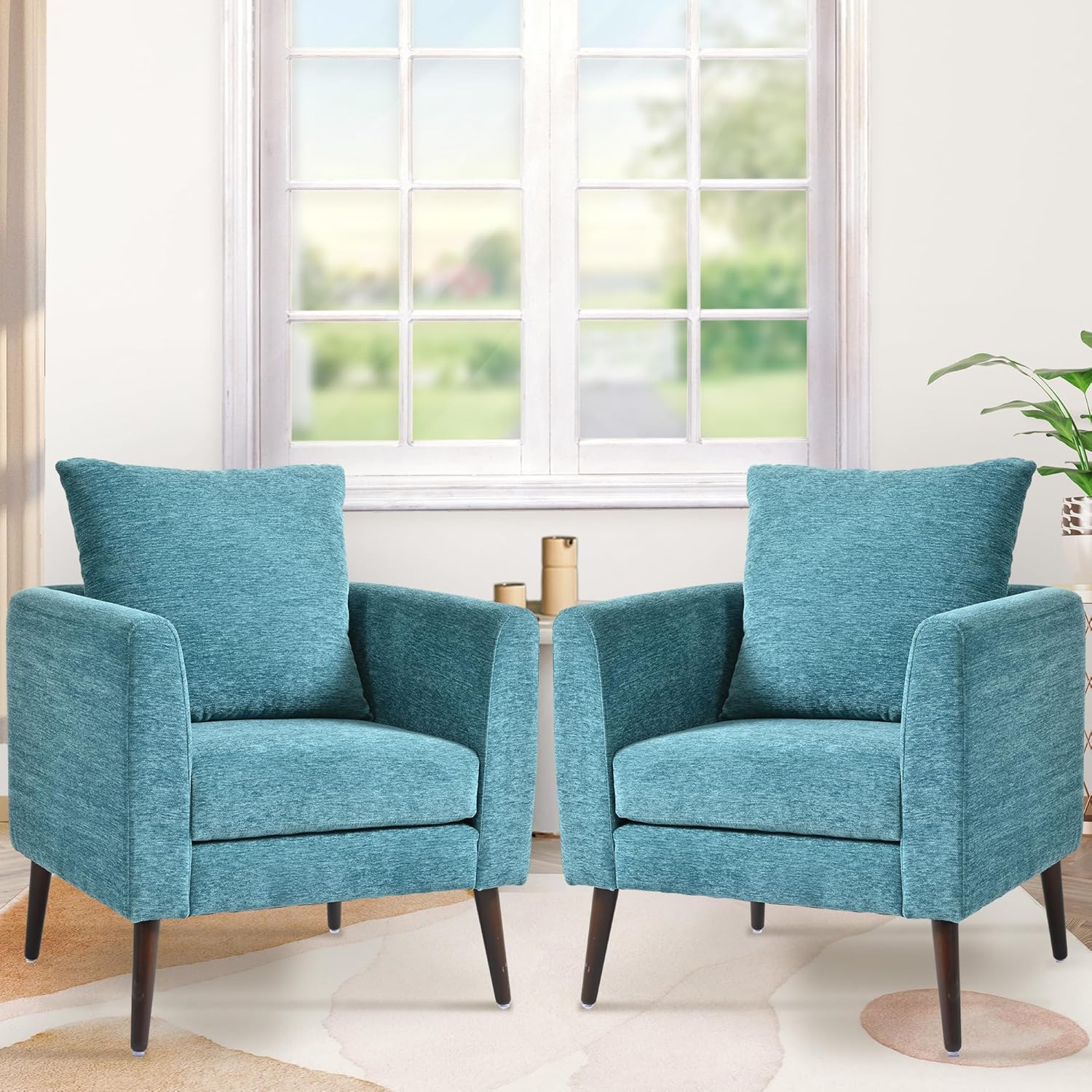 Barrel Accent Chair Set of 2 with Back Pillow, Large Upholstered Armchair with Solid Wood Legs Modern Reading Chairs for Living Room Bedroom