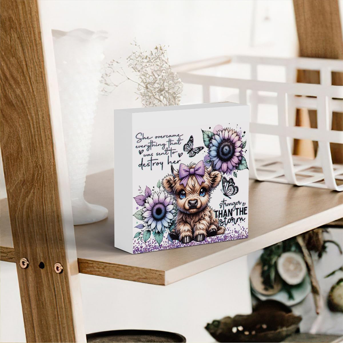 Cute Highland Cow Baby Decor, Highland Cow Sunflower Decor, Highland Cow Gifts for women, Highland Cow Nursery Decor, Wooden Box Decor Sign for Home Farmhouse Office Living Room Table Shelf