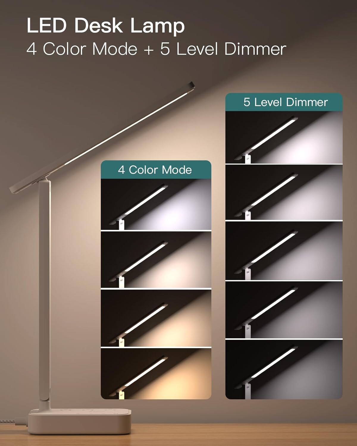 Addtam LED Desk Lamp, Power Strip with 3 Outlets 4 USB Charging Ports(2 USBC), 4 Modes 5 Level Brightness Touch Lamp, Small Desk Lamp for Home Office College Dorm Room Essentials, White