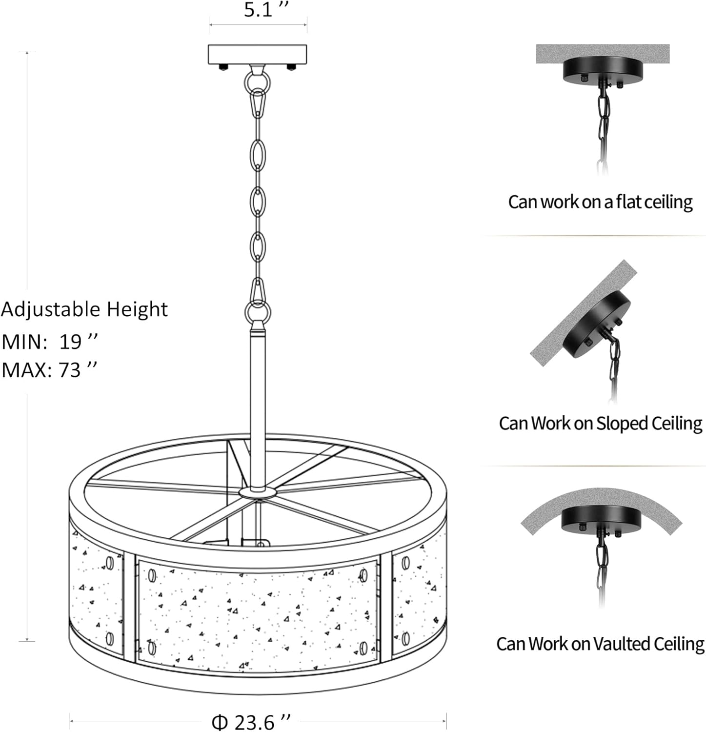 • Adjustable Height: Diameter: 23.6 in, Height: 19-73 in, Canopy Diameter: 5.1 in. Flat,sloped and vaulted ceilingsare compatible. Easily customize the height of this large black chandelier according to your preferences.