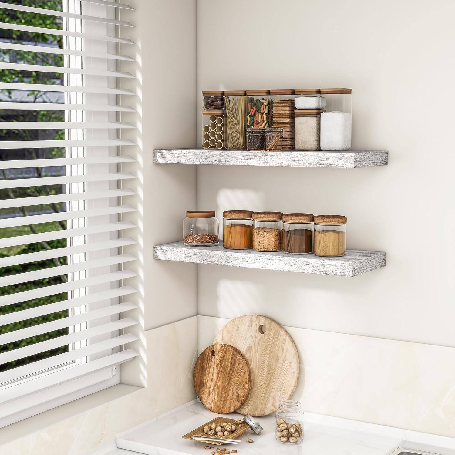 - 31.5 Inch Floating Shelves for Wall (Set of 2): Each wall shelves are 8 inches in depth and 1.5 inches in thickness. 2-piece set is more cost-effective and practical. Our wall shelf can be used in combination, staggered high or low on the wall, or mounted side-by-side to provide extra storage space for organizing small items and clutter in multiple areas such as kitchens, bathrooms, and bedrooms, creating a clean and smooth look. Multiple colors available