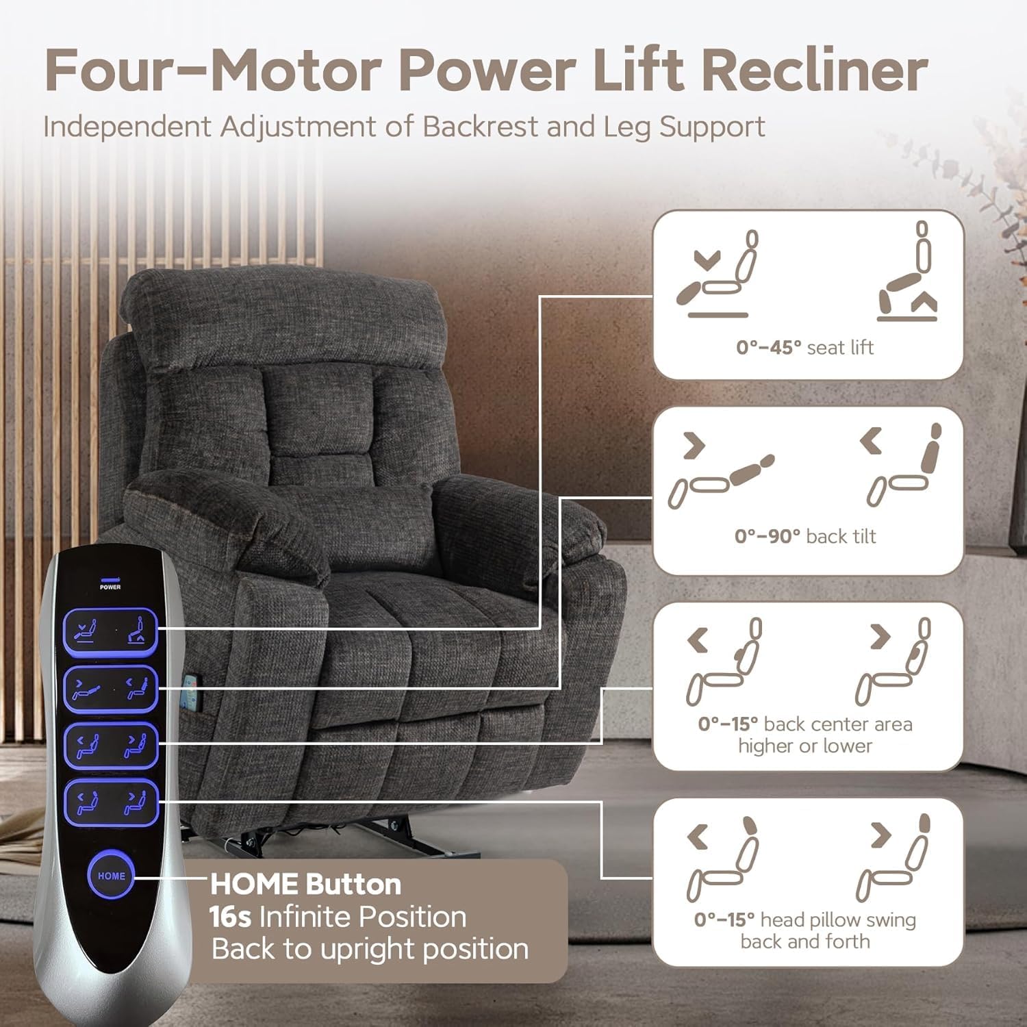 - 【Power Headrest & Lumbar】Power lift recliner built-in motor independently adjusts the headrest and lumbar part; without the influence of your body shape and sitting posture, you can enjoy the most comfortable angle and maximize the different body shapes of the user to get the most comfortable experience.