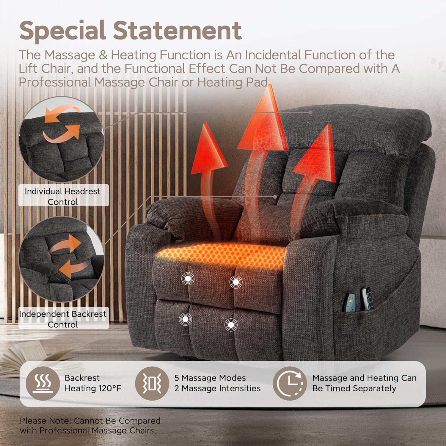 - 【Vibration Heating Massage】This power recliner chair has four massage points (thighs, legs), three adjustable modes, three vibration intensity options, and three massage durations. You can choose the desired massage area, intensity, mode, and time to eliminate body fatigue. The seats position of the power recliner also includes a heating function; the surface temperature is maintained at 113℉-140℉, which promotes blood circulation and relaxes the whole body.