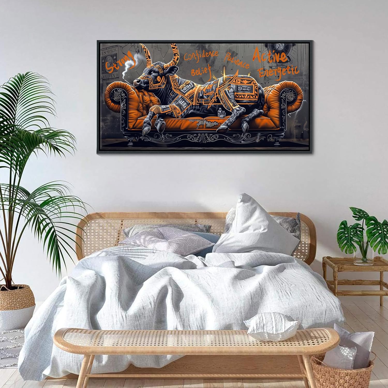 JEAWA Framed Canvas Wall Art - Creative Wall Art for Bedroom Living Room Bathroom, Modern Artwork Decor for Home Decoration, Strong Bull Color Graffiti, 20x40 IN