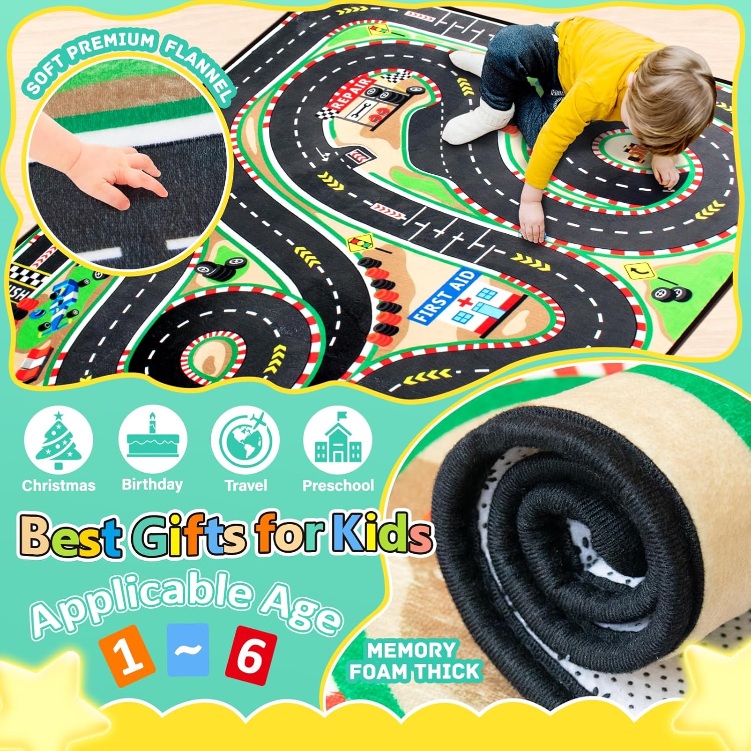 Kids Rug, Race Track Baby Play Mats, Realistic 3D Cascading Surround Route, 4x6 Ft Kids Rug for Playroom, Great for Playing with Cars and Toys, Non-Slip Car Carpet