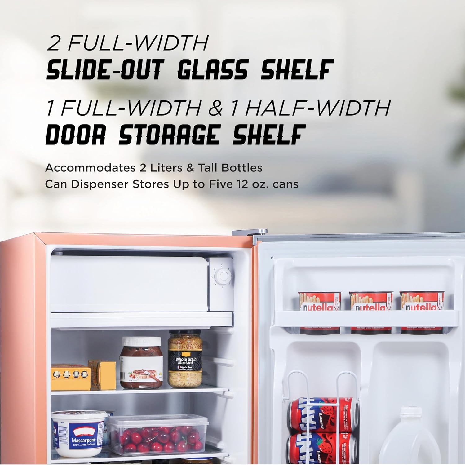 - Large Capacity: 2 removable glass refrigerator shelves help expand storage space while a full-width door storage shelf accommodates cans and small containers or 2-liter bottles